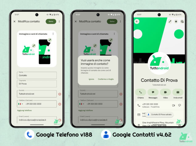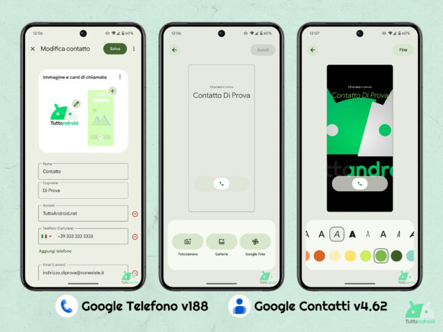 Proprio per questo motivo, tale funzione coinvolge trasversalmente sia Google Contatti (che è il mezzo per la personalizzazione effettiva della Card) che Google Telefono (che ce la mostra quando abbiamo una chiamata in arrivo e durante la chiamata stessa) ed è in rollout per la maggior parte degli utenti che eseguono la versione 4.62 dell’app per la rubrica e la versione 188 (stabile) dell’app per le chiamate.