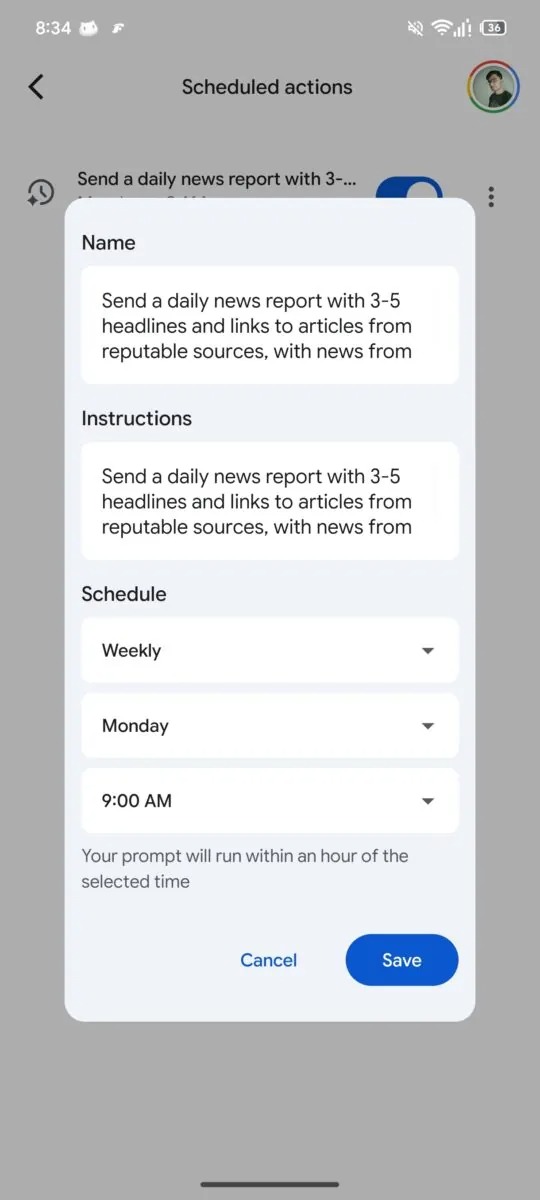 Con la nuova versione Beta 16.38.62.sa.arm64 dell’app Gemini, Google ha finalmente risolto la questione, toccando il menù a tre puntini accanto a un’azione pianificata compare ora la voce Modifica; da qui è possibile intervenire su tre campi fondamentali come nome, istruzioni e pianificazione, attraverso una finestra di dialogo integrata nell’app. In altre parole, l’esperienza del portale web viene portata su smartphone, rendendo la gestione delle azioni molto più fluida e veloce.