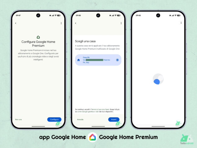 Procedendo con la configurazione, ci verrà chiesto di scegliere una casa (premere “Avanti” implica che accettiamo i Termini di servizio Nest); dopo una breve attesa, in cui l’app verificherà la disponibilità di dispositivi compatibili con le funzioni avanzate che sblocca l’abbonamento, verremo informati del fatto che l’abbonamento sia stato applicato e potremo poi gestirlo tramite la sezione “Abbonamenti” tra le impostazioni dell’app.