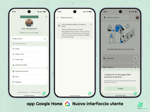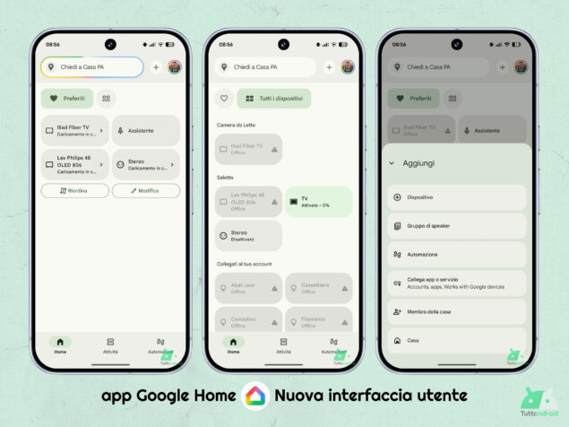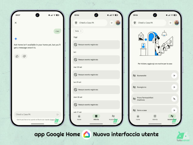 Una volta che la richiesta verrà accolta e saremo inseriti in questo programma, chiudendo e riaprendo l’app otterremo subito la nuova versione dell’interfaccia utente, semplificata su tre schede (dalle precedenti cinque): Home (ospita i dispositivi preferiti e tutti i dispositivi), Attività (integra una cronologia degli eventi unificata) e Automazioni (che gode di alcuni miglioramenti, anche all’editor). Nella parte alta delle schede è presente Ask Home (“Chiedi a Casa” in italiano) che consentirà di interagire con Gemini.