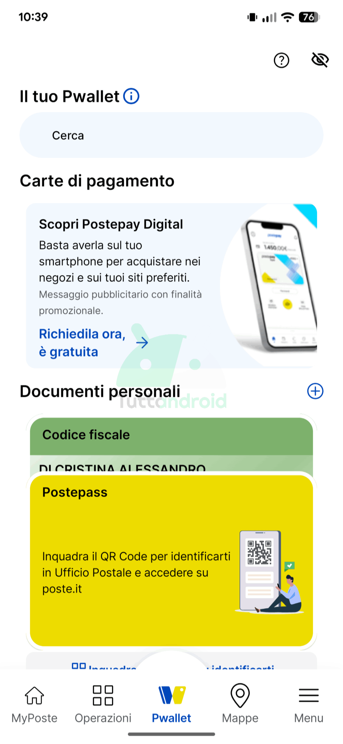 All’interno dell’app è anche presente il Pwallet, un wallet digitale che contiene al suo interno le carte di pagamento, i dati dei documenti d’identità (passaporto, carta d’identità, patente e tessera sanitaria) e le carte fedeltà.