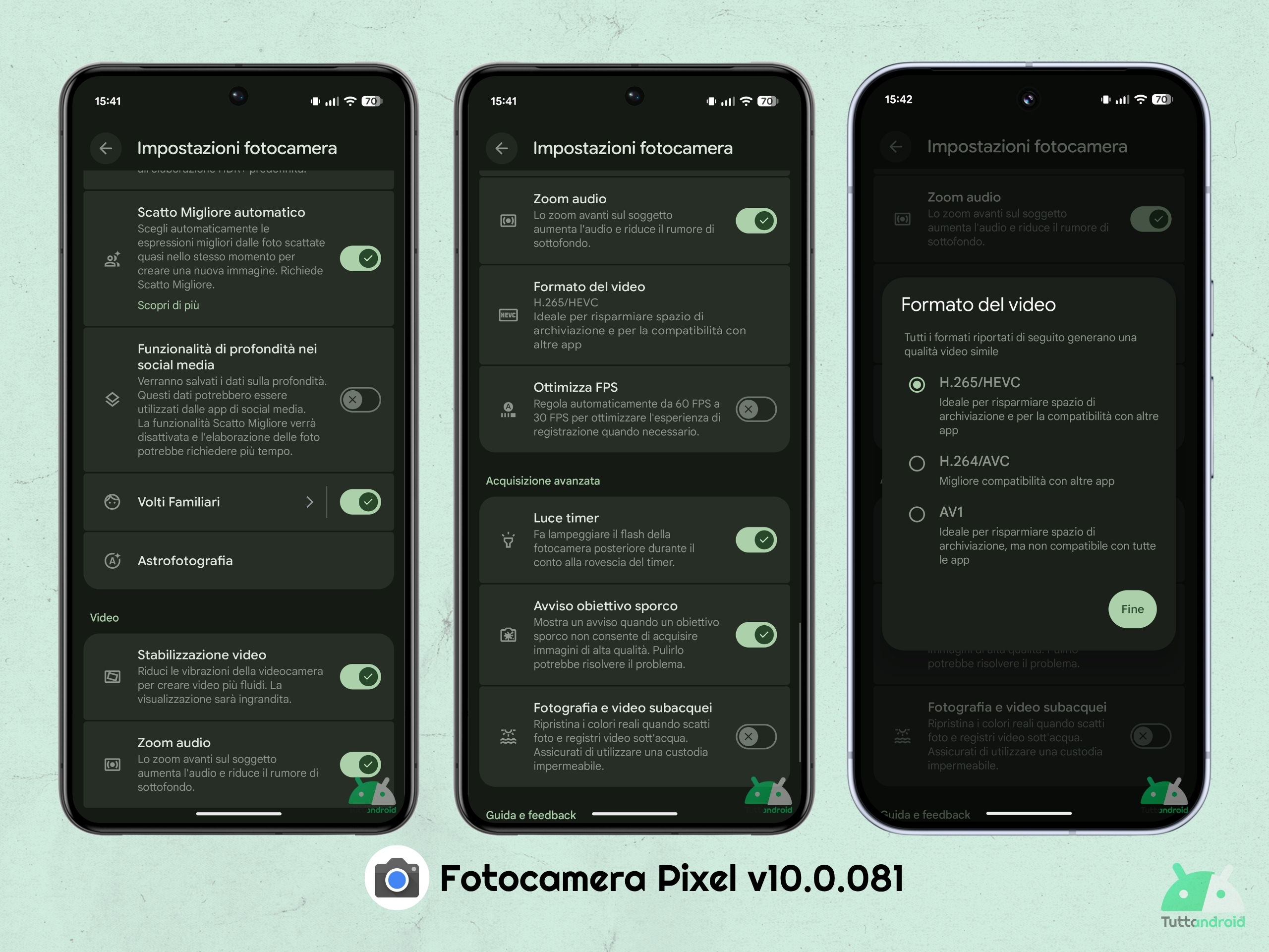 Con la versione 10.0.081, le impostazioni di Fotocamera Pixel presentavano il tema scuro a prescindere dal tema impostato sul dispositivo; con la nuova versione, invece, tornano ad adattarsi al tema impostato sul dispositivo e quindi supportano nuovamente anche il tema chiaro.