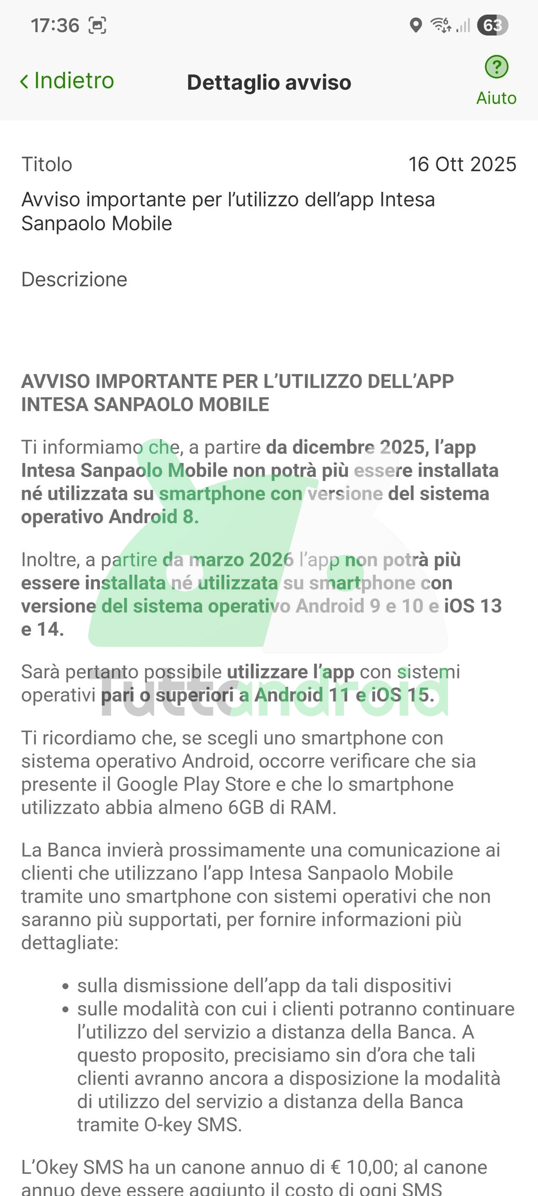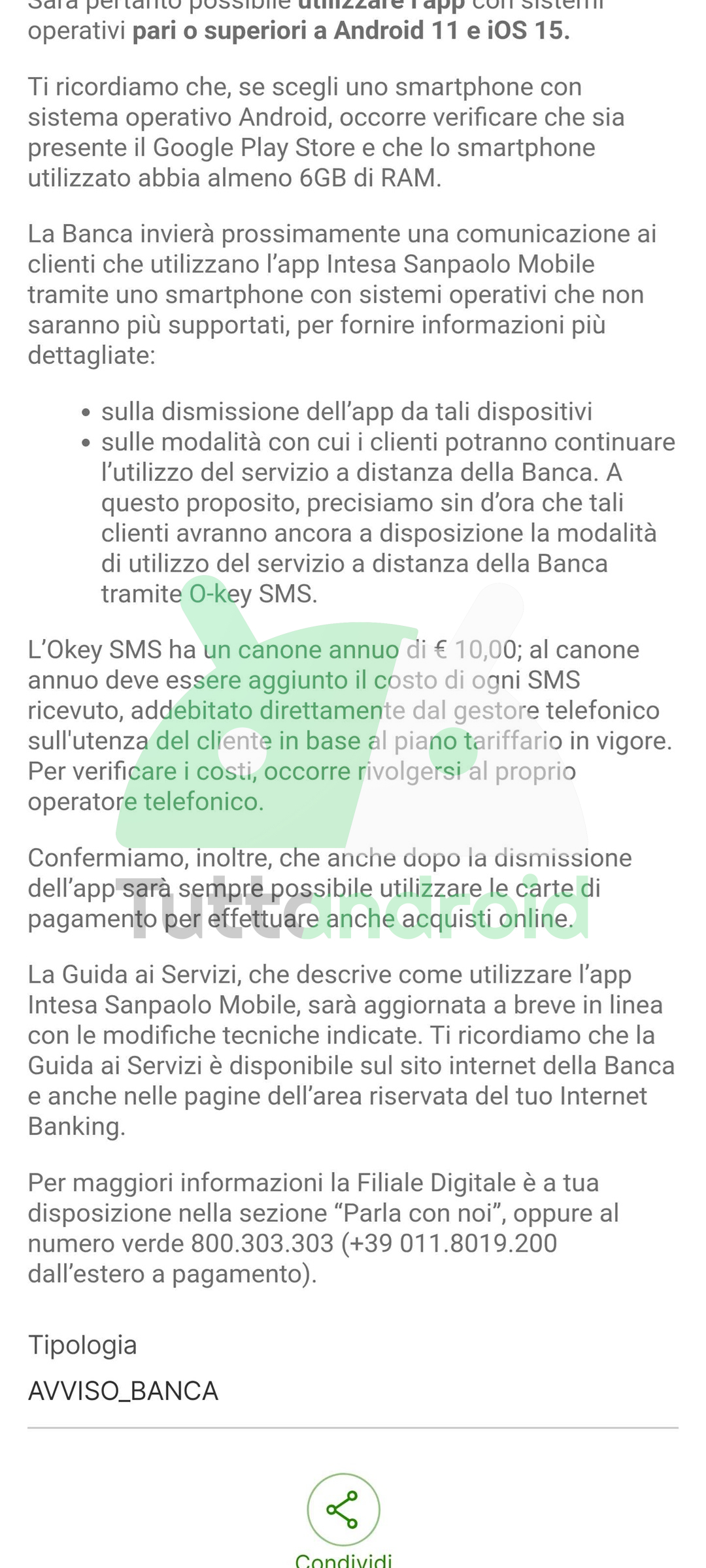L’avviso, condiviso poco sotto nella sua forma integrale, mette al corrente gli utenti del fatto che la Banca invierà prossimamente una comunicazione ai diretti interessati (ovvero a coloro che sfruttano l’app su dispositivi che diventeranno obsoleti) per fornire informazioni più dettagliate su ciò che avverrà.