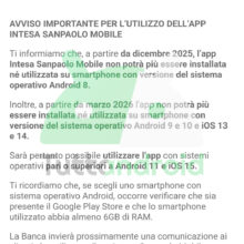 In attesa che la nuova app di Intesa Sanpaolo raggiunga effettivamente tutti gli utenti, il gruppo bancario ha iniziato ad avvisare gli utenti del fatto che prossimamente l’app smetterà di funzionare con determinati dispositivi.