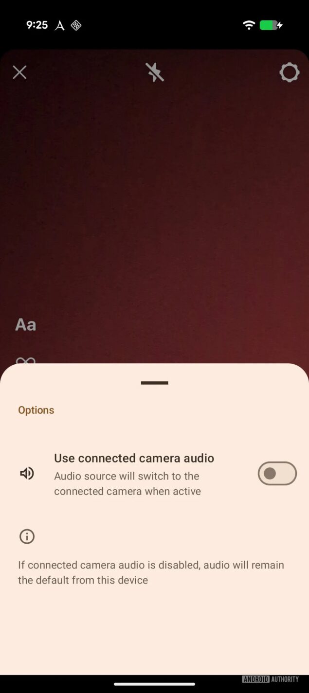 Da questo pulsante si accede a un menù (a comparsa dal basso) che contiene una sola opzione “Usa l’audio della fotocamera connessa”. Se abilitiamo questa opzione, l’audio verrà catturato dalla fotocamera connessa; in caso contrario, possiamo cambiare il flusso video ma mantenere comunque l’audio catturato dalla sorgente principale (ovvero il Pixel che funge da regia).