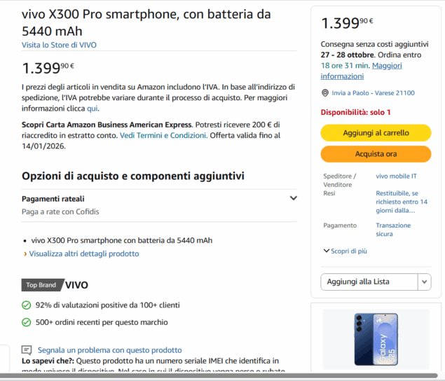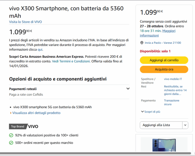 Se volete iniziare a dare uno sguardo alle pagine Amazon dedicate a Vivo X300 e Vivo X300 Pro potete seguire i link qui in basso. Non tenete in considerazione le immagini, che saranno aggiornate con quelle corrette una volta che i due smartphone saranno effettivamente lanciati. Volendo, potete già iniziare ad acquistare i nuovi smartphone, che risultano venduti e spediti proprio da vivo mobile IT, anche se in pochissimi pezzi: i prezzi indicati da Amazon Italia sono di 1099,90 euro per Vivo X300 e di 1399,90 euro per Vivo X300 Pro, ma non sappiamo a quali configurazioni si riferiscano.