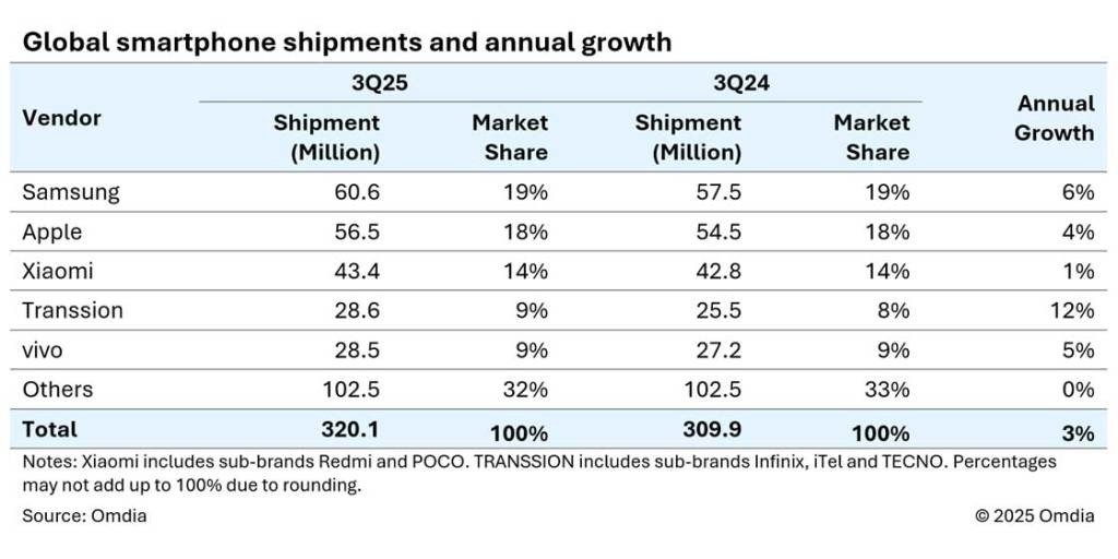 Anche Samsung Galaxy Z Flip7 ha contribuito al risultato raggiunto dalla casa coreana, seppur in maniera minore, mentre la serie dei Galaxy S25 ha avuto un impatto più contenuto nell’ultimo trimestre. Nel complesso, però, la quota di mercato globale resta invariata per il secondo anno consecutivo: Samsung guida il podio con il 19% di quota globale, seguita da Apple con il 18%. Si tratta anche del secondo anno consecutivo in cui le due aziende hanno registrato un aumento, dopo che entrambe avevano subito un calo nel 2023.