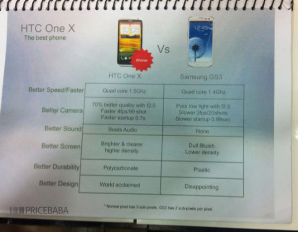 HTC sta attraversando un brutto periodo. Nonostante abbia lanciati alcuni dei migliori smartphone del 2012, il successo enorme ed esplosivo non arriva. One X è uno splendido smartphone che abbiamo avuto l’occasione di recensire e siamo rimasti piacevolmente colpiti da più di un aspetto dell’attuale portabandiera di HTC. Tuttavia, è inevitabile fare un paragone con il Samsung Galaxy S III: il periodo di lancio, la tipologia di processore, le dimensioni, i materiali… Molte cose sono simili, ma i due smartphone sono del tutto diversi. È difficile scegliere quale dei due acquistare, se si ha la fortuna di poterseli permettere. Per questo motivo HTC ha messo insieme una rapida comparativa che mette in luce i pregi di One X rispetto al Galaxy S III – si tratterebbe di un documento interno, probabilmente destinato ai promotori ed ai responsabili del marketing, che però è sfuggito al controllo della società taiwanese ed è arrivato sulla Rete.