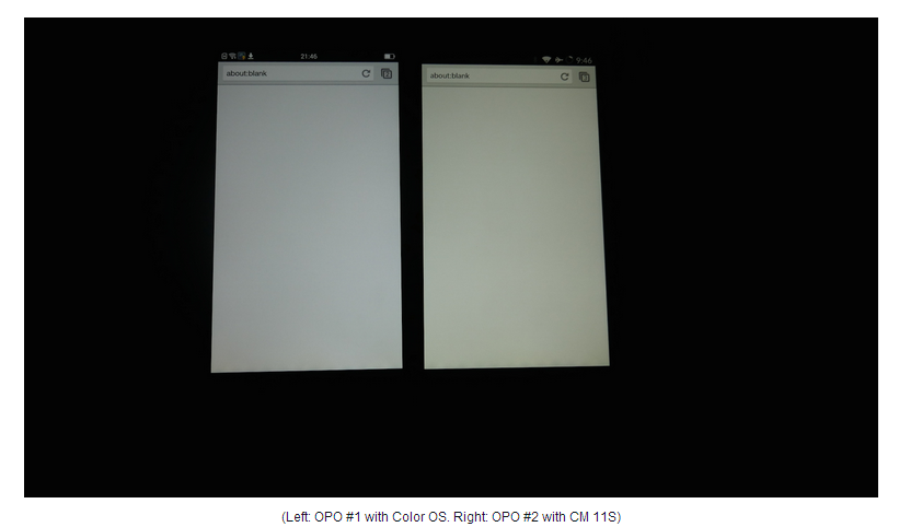 - Software: l’ultimo aggiornamento della CyanogenMod 11S è realizzato proprio per visualizzare le tonalità dei colori in questo modo, affinché l’utente possa leggere i contenuti con sfondo bianco per ore senza affaticare la vista. E’ comunque possibile variare la temperatura dalle impostazioni del display e prossimamente saranno disponibil anche diversi pre-set da poter applicare. Per assicurarvi che le tonalità possono essere modificate attraverso il software, e che quindi non c’è un reale problema hardware, il produttore cinese ha installato su un One con Color OS la CM 11S e su un One con CM 11S la Color OS, mostrando i colori prima e dopo l’installazione con la luminosità al 100%.