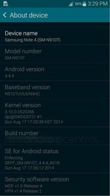 La seconda immagine è invece molto più interessante, poiché ci mostra le info di sistema svelandoci alcune informazioni, ovvero che il Galaxy Note 4 avrà già al lancio Android 4.4.4 KitKat e che il software utilizzerà il kernel 3.10, che a questo punto ci aspettiamo anche sui prossimi Nexus. Purtroppo le nuove informazioni finiscono qui, ragion per cui non ci resta che darci appuntamento alla prossima fuga di notizie o male che vada all’IFA.