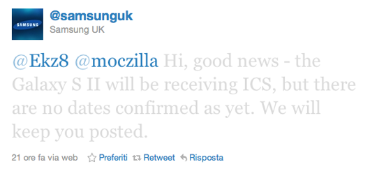 Conferme ufficiali per tutti i possessori del Samsung Galaxy S 2, uno dei dispositivi con Android più venduto nel mondo. Secondo Samsung UK infatti, arriverà ufficialmente l’aggiornamento ad Android 4.0 Ice Cream Sandwich.