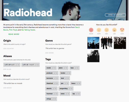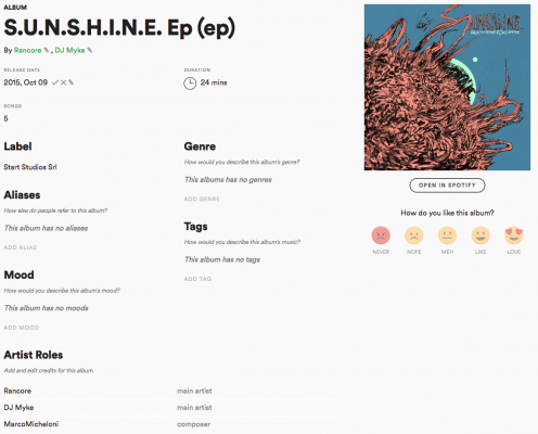 Tanto per rendere l’idea Spotify vi invita a completare i campi mancanti quali tag, generi, link esterni e altre informazioni che possano essere utili per la ricerca e la fruizione di una certa canzone o di un album ad esempio. Come visibile nelle immagini sopra è possibile peraltro inviare una delle cinque reazioni presenti.