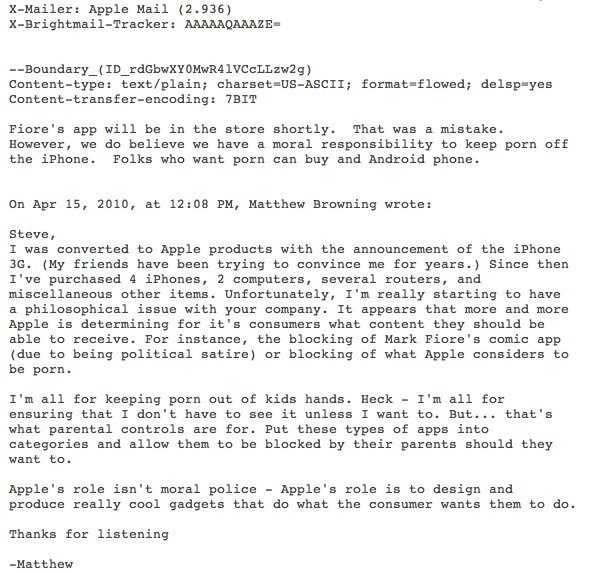 Alla conferenza stampa dell’OS 4.0 Steve disse che Apple ha tanto controllo sui propri terminali per evitare che ci giri sopra qualsiasi contenuto multimediale riservato ad un pubbico adulto sottolineando il fatto che chi cerca il porno può benissimo acquistare un telefono Android. Recentemente però ha ribadito il concetto scrivendo in fondo alla risposta di un’email: