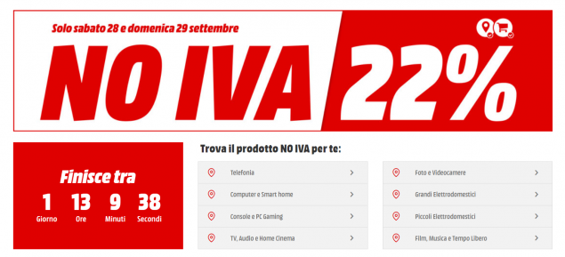MediaWorld rilancia la sua promozione NO IVA, che sconta l’IVA su tanti prodotti tra cui una fornita selezione di smartphone; l’offerta è valida oggi, 28 settembre, e domani, 29 settembre, nei punti vendita MediaWorld e sul sito di MediaWorld, e permette di sfruttare uno sconto del 18,04% (22% al netto dell’IVA).
