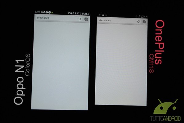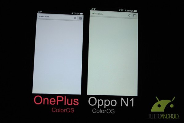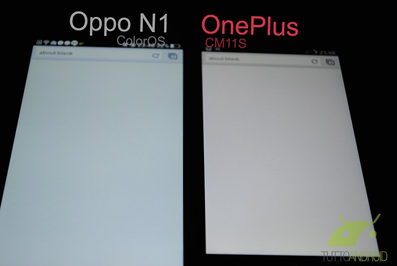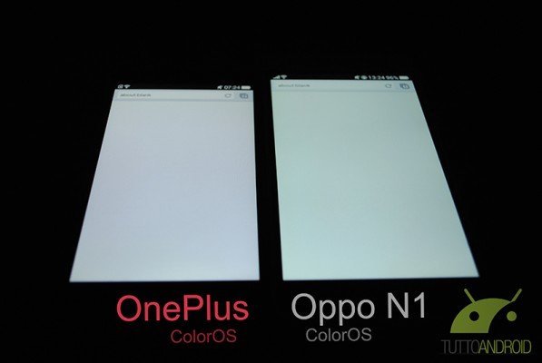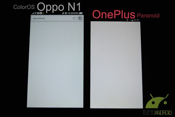 Come già accennato alla fine del fine del video unboxing, ecco un confronto diretto tra i display di OnePlus One e Oppo N1, entrambi IPS, a luminosità massima. Il discusso “problema” del display giallo si conferma essere correlato ad un settaggio cromatico di CyanogeMod. Come è possibile vedere dalle foto qui sopra, se montando CM11S o Paranoid Android il display di OnePlus One è più giallino di quello di Oppo, flashando invece ColorOS su OnePlus One la situazione si ribalta, a riprova che non siamo di fronte ad un problema a livello hardware.