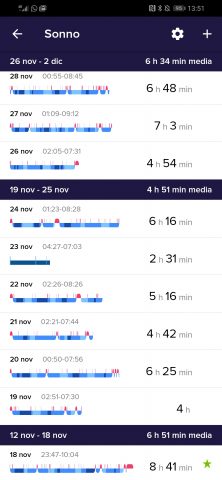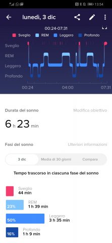 Ovviamente misura i passi (fornendo anche una stima dei km percorsi), le calorie bruciate, i minuti di attività e il numero di scale fatte durante il giorno. Durante la notte invece automaticamente misura la qualità del sonno suddividendo i momenti in fasi di sonno leggero, profondo, REM e sveglio.
