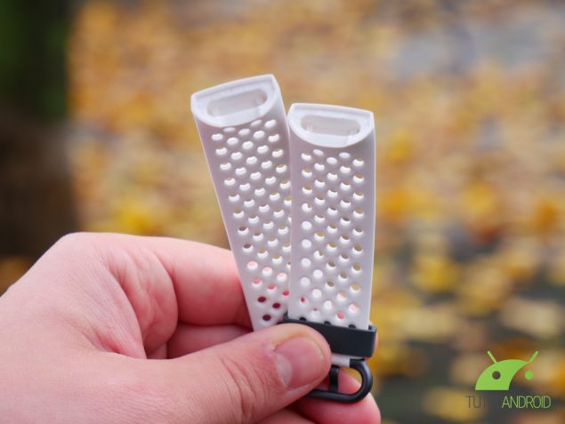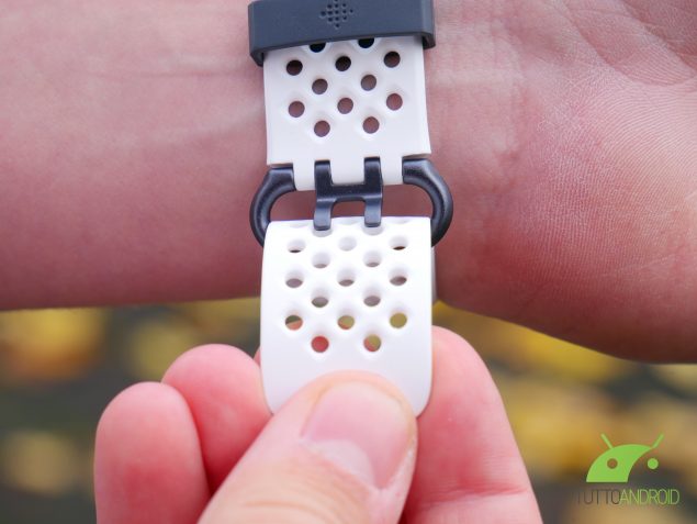 La cassa del Fitbit Charge 3 è in alluminio e vetro mentre il cinturino in gomma morbida. In confezione sono presenti due cinturini, quello bianco che potete apprezzare in foto ed uno nero con una trama a triangoli, entrambi presenti in due diverse dimensioni per meglio adattarsi alla grandezza del vostro polso. Il cinturino bianco l’ho trovato estremamente comodo essendo particolarmente traspirante, molto valido da indossare sia di giorno, durante l’attività fisica, che di notte, mentre si dorme. Ed essendo questo uno dei punti più critici per il sottoscritto con Fitbit Charge 3 e questo cinturino ho trovato la pace dei sensi.