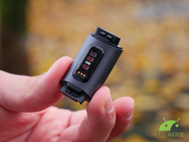 In dotazione è presente un cavo di ricarica USB con una sorta di morsa per agganciare il fitness tracker e ricaricarlo, ricarica che avviene in circa 2 ore.