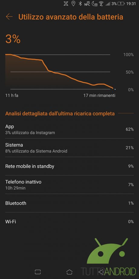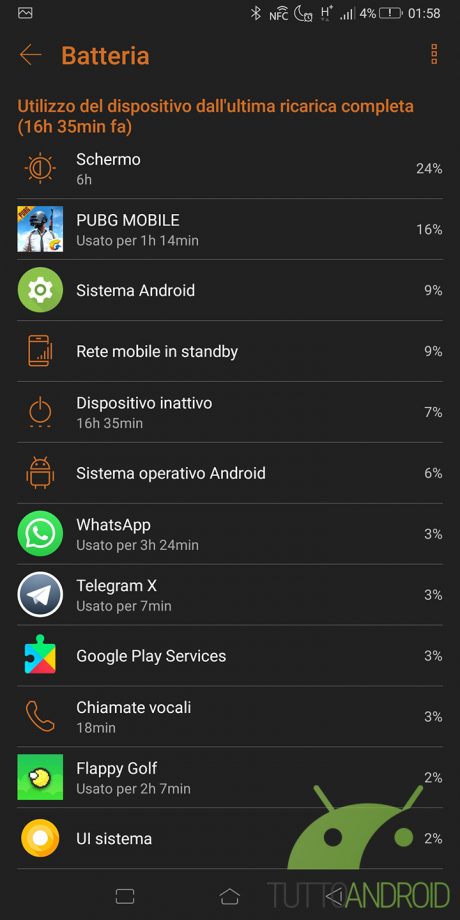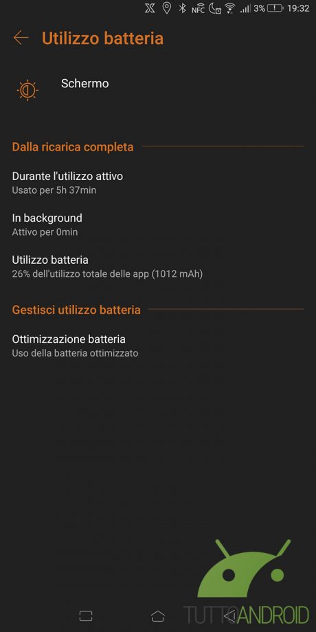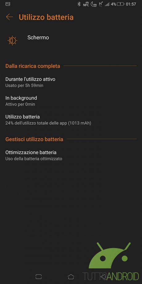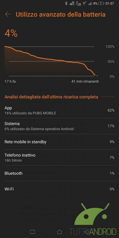 Un punto significativo in questa recensione di ASUS ROG Phone è dato dalla batteria da ben 4000 mAh. L’autonomia dipende in buona parte dal display. Impostando il refresh rate a 90 Hz si riesce ad arrivare a sera con uso intenso e molto gaming con circa 5 ore e mezza o a volte anche 6 ore di display attivo, ma dovendo probabilmente ricaricare un po’ se si vuole uscire di casa. Con il display impostato a 60 Hz invece si arriva tranquillamente a 6 ore di display attivo a notte inoltrata.