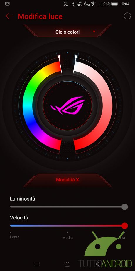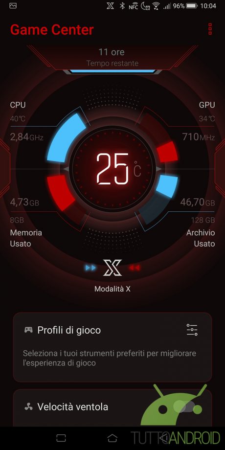 La modalità X è la modalità in cui lo Snapdragon 845 viene spinto fino a 2,96 GHz, aumentandone le prestazioni (ma anche i consumi). Tramite il Game Center si ha una buona panoramica sullo stato dello smartphone ed è possibile personalizzare il comportamento della modalità X, gioco per gioco, limitando ad esempio per alcuni il clock a valori più bassi. Inoltre il Game Center presenta il controllo sulla velocità della ventola dell’Aero Active Cooler – quando è connesso – e sull’Illuminazione Aura del LED RGB sul retro. Il LED è personalizzabile con due diversi profili per l’uso standard e la modalità X e è inoltre sincronizzabile con eventuali altri dispositivi da gaming compatibili con la tecnologia Aura di ROG.