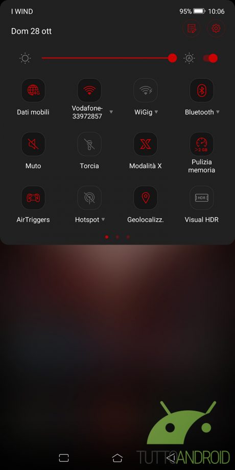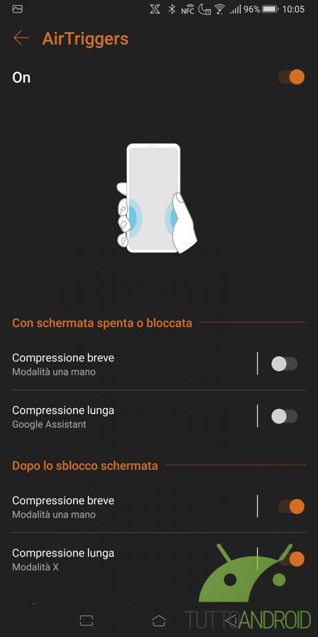 Passando però a tutte le funzionalità legate al gaming, nella voce relativa alle Impostazioni Avanzate c’è il controllo sugli AirTrigger, i sensori ultrasonici presenti sul lati del ROG Phone. Una volta attivati è possibile regolare la loro sensibilità e consentono di riconoscere la pressione quando si stringe saldamente in mano lo smartphone, potendo personalizzare alcune azioni in risposta a una pressione breve o una pressione prolungata, a schermo acceso o a schermo spento. A schermo spento sconsiglio di attivarli, in quanto porterebbero ad azioni non volute molto spesso, mentre a schermo acceso li ho usati per passare velocemente alla comoda modalità ad una mano – che riduce la porzione attiva del display – e per entrare e uscire dalla modalità X.