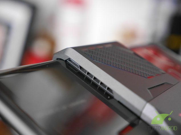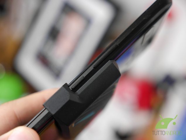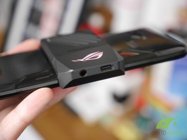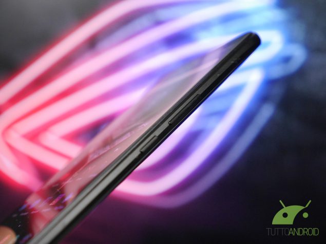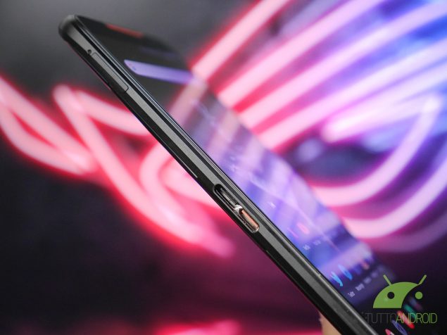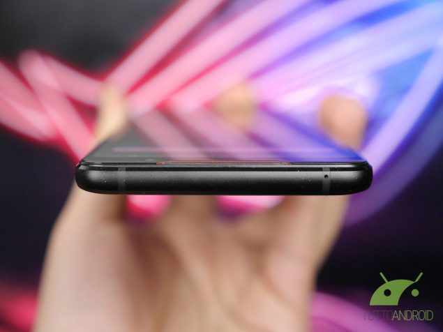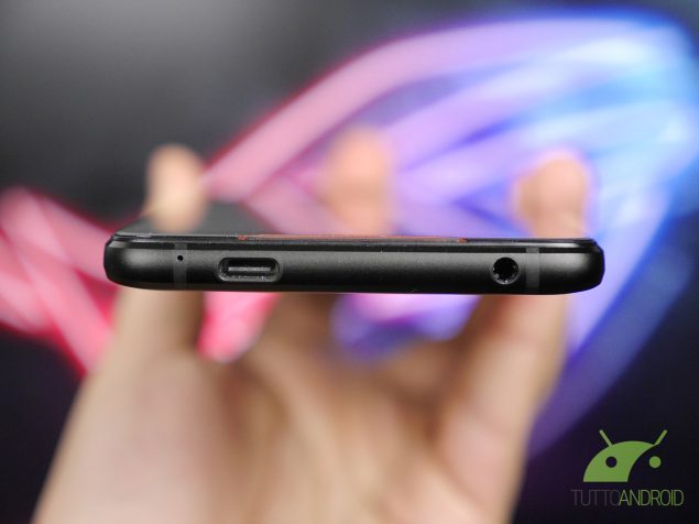A livello di elementi fisici sui bordi dello smartphone, il ROG Phone presenta molte particolarità. Sul lato destro trovano posto il pulsante per l’accensione, il bilanciere del volume, un microfono terziario e due sensori ultrasonici per gli AirTrigger (che tratteremo nella parte software). Sulla parte alta c’è solamente il microfono secondario. Sulla parte sinistra invece le cose si fanno interessanti, perché oltre al carrellino per le due NanoSIM e al terzo AirTrigger, c’è uno sportellino coperto da un gommino che nasconde due porte USB Type-C affiancate: tali porte servono per collegare gli accessori ufficiali del ROG Phone, ma quella nera si può usare anche per la normale ricarica. Sul fondo poi troviamo il microfono principale, una porta USB Type-C e il jack da 3,5mm per le cuffie cablate.