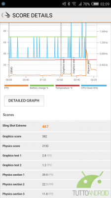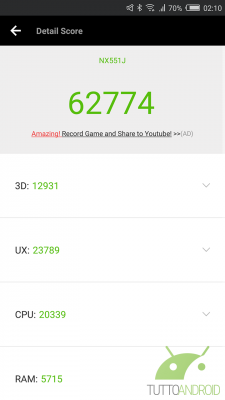 Nubia M2 non è alla pari di un top di gamma in quanto a reattività e fluidità di sistema, ma è uno smartphone molto concreto. Qualsiasi cosa si faccia non presenta mai impuntamenti o rallentamenti vistosi, ma restituisce invece sempre un’esperienza di buon livello nonostante non sia fulmineo. In particolare nel gaming con Real Racing 3 i dettagli sono alti e il framerate costante.