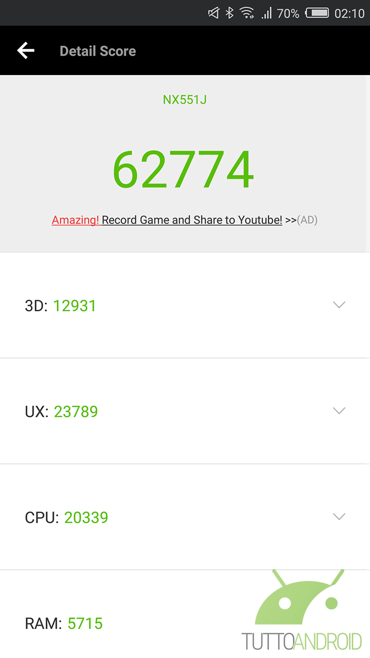 Nubia M2 non è alla pari di un top di gamma in quanto a reattività e fluidità di sistema, ma è uno smartphone molto concreto. Qualsiasi cosa si faccia non presenta mai impuntamenti o rallentamenti vistosi, ma restituisce invece sempre un’esperienza di buon livello nonostante non sia fulmineo. In particolare nel gaming con Real Racing 3 i dettagli sono alti e il framerate costante.