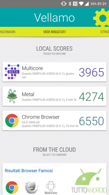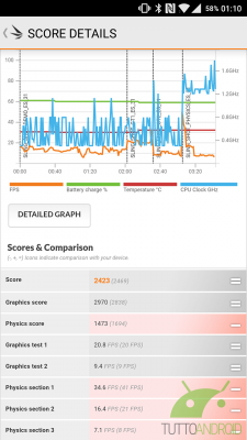 In navigazione web non si notano mai ricaricamenti degli elementi e nel gaming con Real Racing 3 i caricamenti sono rapidi e in gioco il framerate è elevato e costante, senza nemmeno problemi di surriscaldamento. Grazie poi ai 6 GB di RAM inoltre le app rimangono in memoria molto a lungo, per cui la maggior parte delle volte non richiedono di essere ricaricate. Di seguito potete visionare i risultati ottenuti nei nostri classici benchmark, con in particolare un punteggio Antutu da record.