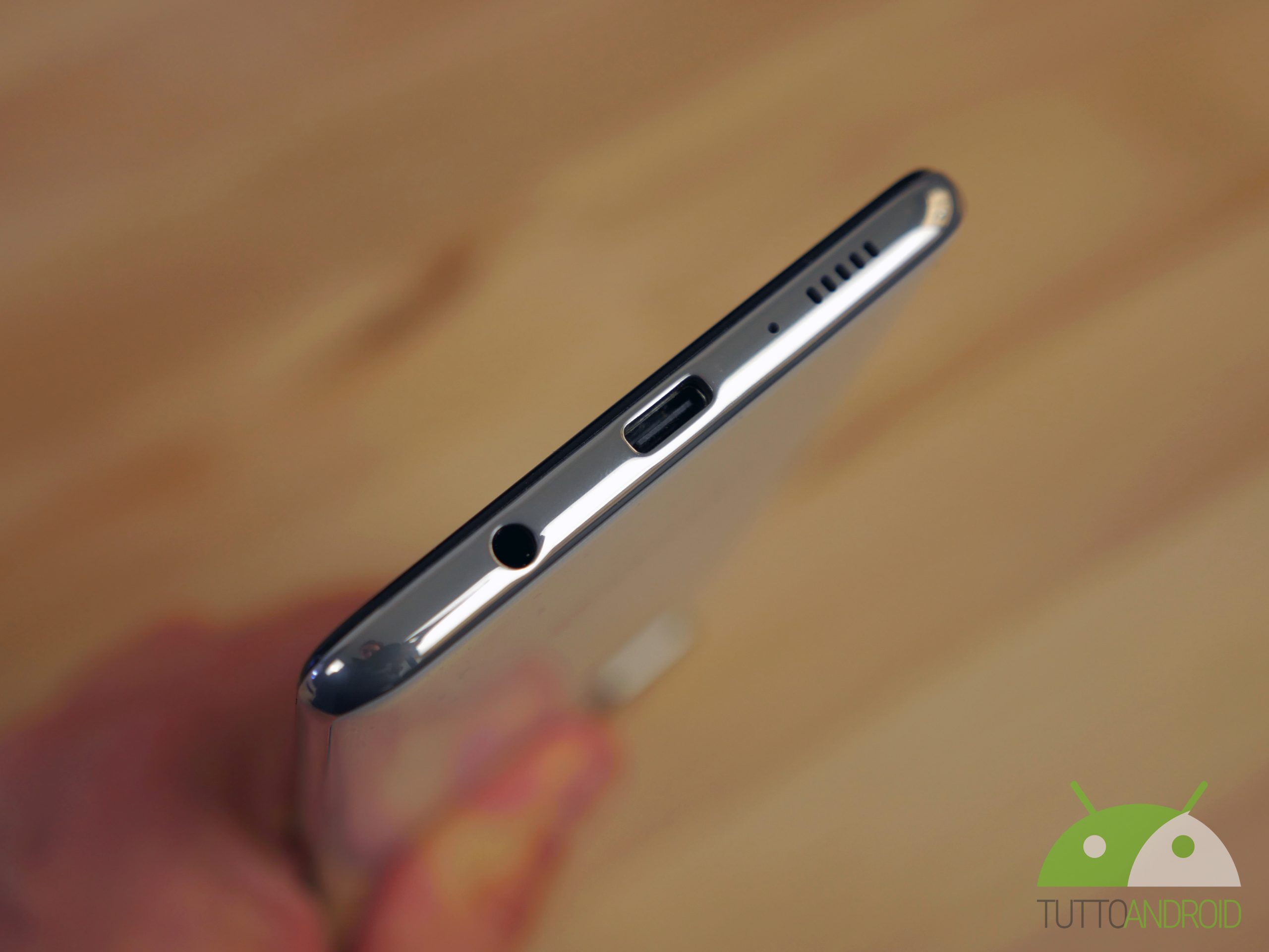 Anche i bordi sono completamente in plastica con una rifinitura lucida effetto metallo, sul lato destro sono presenti i tasti Power e il bilanciere del volume. Inferiormente invece sono presenti il foro per il jack audio da 3,5 mm, la porta USB Type-C e il singolo altoparlante in quanto, purtroppo, l’audio è solo mono e la capsula auricolare viene utilizzata solamente per le chiamate.