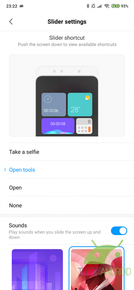 In particolare allo slider è possibile personalizzare l’azione che avviene alla sua apertura tra apertura della fotocamera frontale, apertura di una schermata con strumenti utili, apertura di un’app specifica o nessuna azione. Inoltre l’apertura e la chiusura dello slider può essere accompagnata da un suono, personalizzabile tra varie proposte.