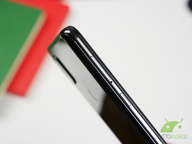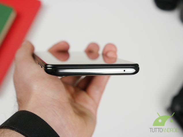 La disposizione degli elementi vede a destra il pulsante di accensione e il bilanciere del volume, mentre a sinistra c’è lo slot per le due NanoSIM e il tasto AI. In alto ha sede il microfono secondario e in basso ci sono due griglie per l’altoparlante mono e il microfono principale, con al loro centro la porta USB Type-C. Manca dunque il jack da 3,5 mm, ma c’è un adattatore type-C a jack in confezione.