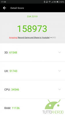 Zuk Edge ha delle performance di elevatissimo livello, con grande reattività e tempi di caricamento ridotti, benché non sia alla pari dei migliori smartphone per fludità sul mercato come OnePlus 3T (recensione). Anche in navigazione web non si notano mai particolari rallentamenti o ricaricamenti degli elementi, nemmeno nei siti più pesanti.