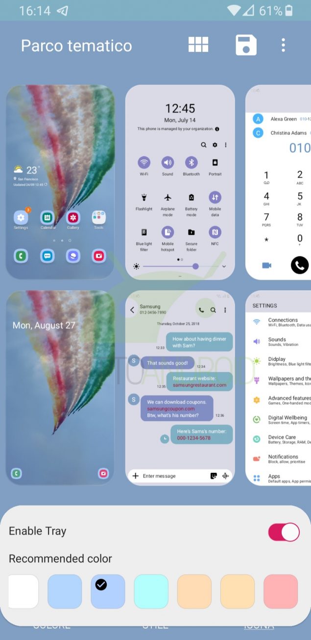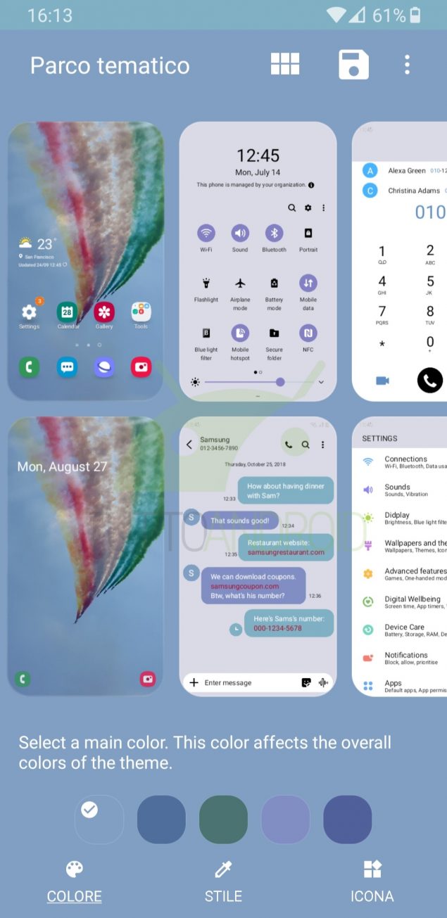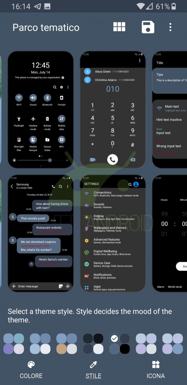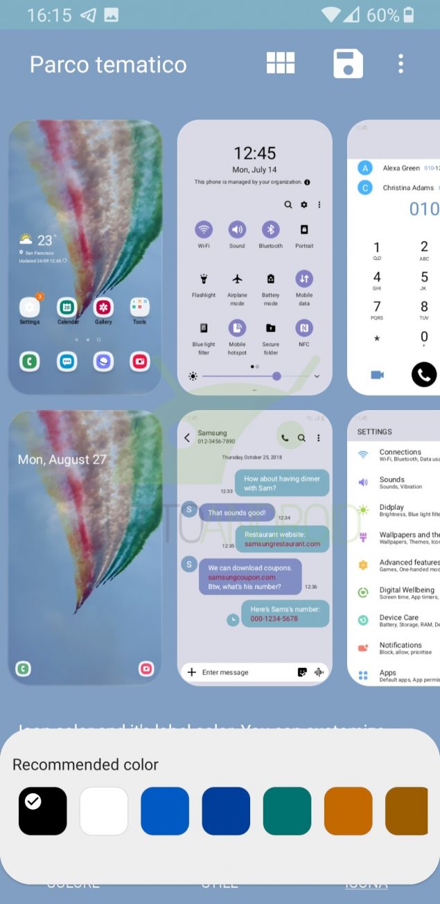 Nonostante la scelta iniziale venga fatta in automatico, gli utenti possono successivamente modificare gli elementi del tema a piacimento, scegliendo tra le varie opzioni: si possono personalizzare gli sfondi delle icone, le etichette delle stesse, i quick toggle, le impostazioni di sistema, il dialer telefonico e qualche altro elemento. Una volta fatto è possibile salvare con nome il tutto all’interno dei temi personali, che saranno poi raggiungibili anche dal Galaxy Themes.
