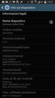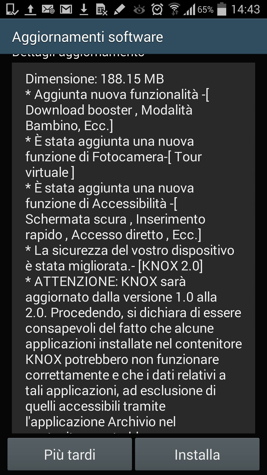 Il changelog, difatti, è alquanto ricco e riporta: aggiunte le funzioni Download Booster e Modalità Bambino; aggiunta la funzione Tour Virtuale nella Fotocamera; aggiunte le funzioni Schermata scura, Inserimento rapido e Accesso diretto in Accessibilità; Knox aggiornato alla versione 2.0. La versione di Android, invece, non cambia e resta la 4.4.2, per cui non viene introdotta la più recente 4.4.4.