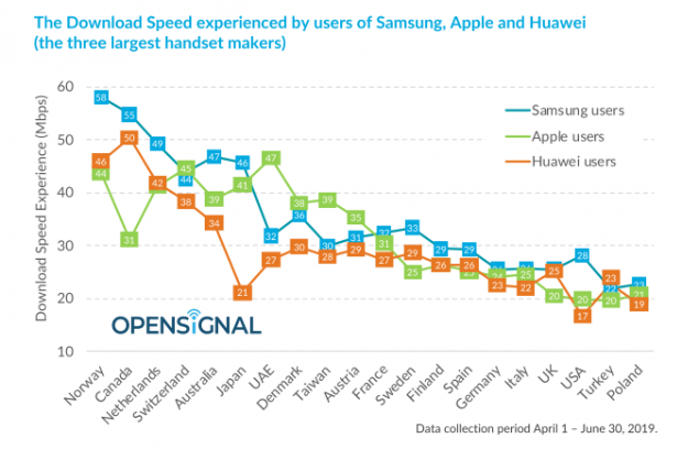 Come possiamo vedere nei grafici qui sopra, il distacco maggiore in media viene raggiunto in Norvegia, con i dispositivi Samsung a 58 Mbps, mentre quelli Huawei e Apple fermi a rispettivamente 46 e 44 Mbps. Più risicata la differenza in Italia, dove siamo, nell’ordine, a una media di 26, 22 e 25 Mbps.