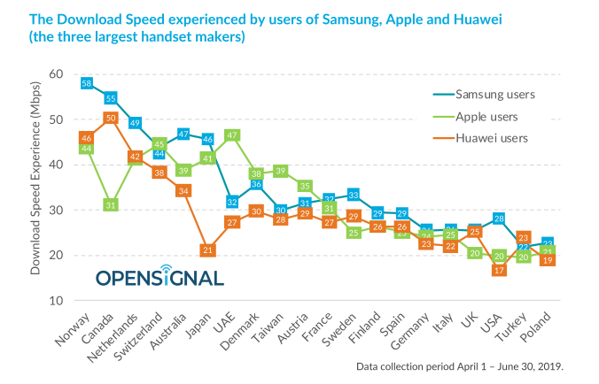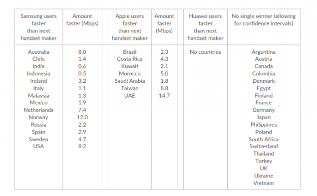 Gli utenti Samsung contano su una velocità di navigazione e download superiore a quella degli utilizzatori di device Apple e Huawei nel 35% dei Paesi analizzati (40 in tutto); Apple supera entrambi solo nel 17,5% dei Paesi, mentre per il restante 48% c’è un sostanziale pareggio. Negli USA, patria di Apple, Samsung la supera di 8,2 Mbps.