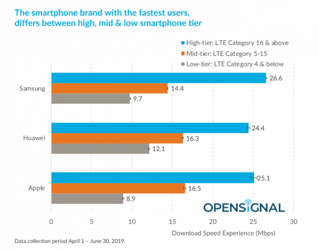 Qui in basso possiamo dare uno sguardo alla suddivisione in base alla fascia dei dispositivi: nei modem top di gamma (LTE Cat. 16 e superiore) Samsung raggiunge in media 26,6 Mbps contro i 24,4 di Huawei e i 25,1 di Apple, mentre nelle altre due fasce hanno la meglio Apple (LTE Cat. 5-15) e Huawei (LTE Cat. 4 e inferiore).