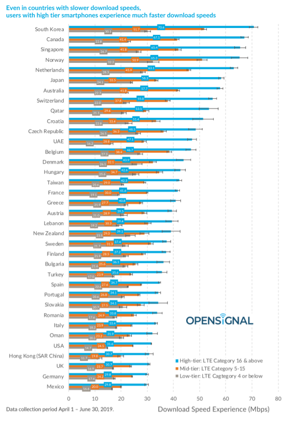 L’analisi tocca anche i giochi multiplayer online, dove ovviamente la velocità e la qualità della connessione risultano importanti. Gli smartphone di fascia alta hanno infatti riscontrato latenze più basse del 18% (11,1 ms) e del 14% rispetto alle fasce media e bassa. Negli ultimi due grafici possiamo infine avere un quadro completo della media di velocità raggiunta in download (e pure in upload nel secondo) nei vari Paesi (l’Italia è al 30° posto).