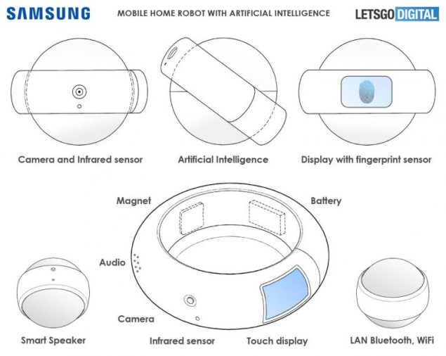 Si tratta di quello che sembra essere un robot domestico dotato di uno smart speaker (probabilmente con Bixby), capace di avvicinarsi all’utente quando sente il comando di attivazione (ciò grazie ad una telecamera e ad un sensore a infrarossi, che gli consentono di esplorare l’ambiente e calcolare la distanza dagli oggetti).