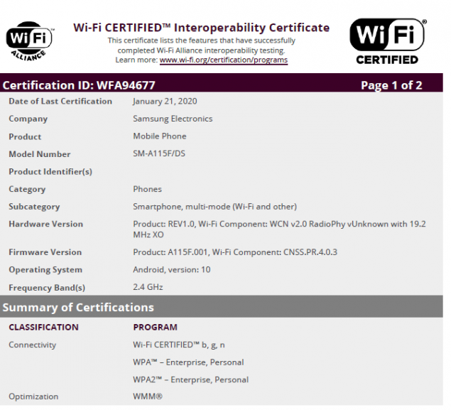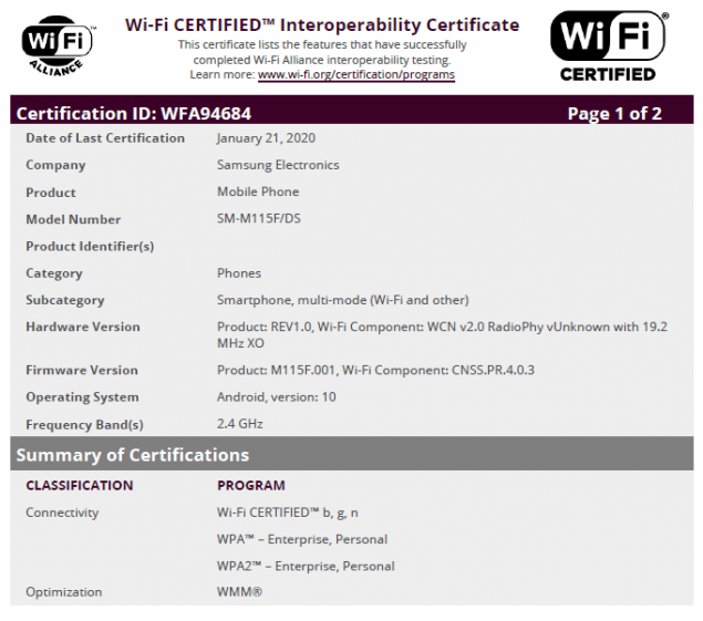 Con tempistiche simili ad un anno fa, Samsung è pronta a rinnovare nella prima parte del 2020 gli smartphone delle linee Galaxy A e Galaxy M. L’intenzione affiora a riguardo di Galaxy A11 e Galaxy M11, che l’azienda immaginiamo vorrà ufficializzare nelle prossime settimane, “beccati” sul portale di Wi-Fi Alliance in occasione della certificazione.