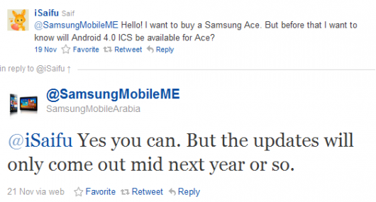 In un messaggio di twitter di SamsungMobileMe infatti, ad una risposta dove appunto gli si chiedeva se il Galaxy Ace fosse aggiornato, prima o poi, ad Android Ice Cream Sandwich, ha risposto affermativamente, ma, bisognerà aspettare almeno la metà del 2012 per riceverlo.