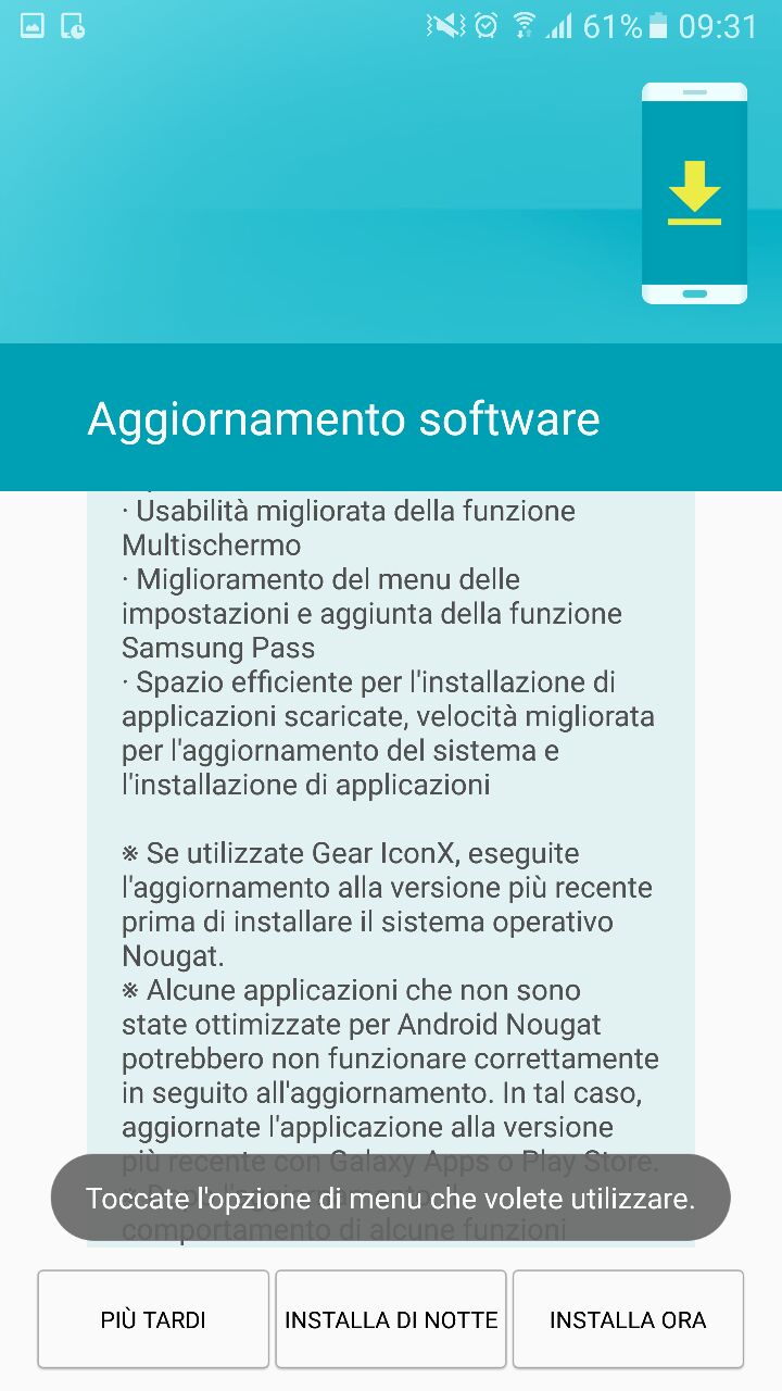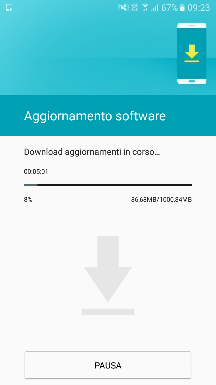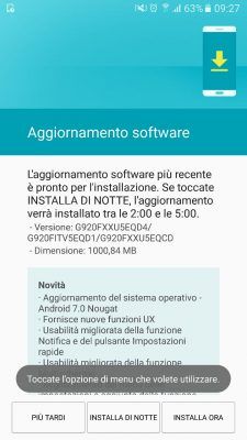 L’aggiornamento è in fase di roll out via OTA in queste ore, come confermato dagli screenshot che potete trovare qui sotto, e dovrebbe quindi raggiungere tutti i dispositivi al massimo nei prossimi giorni; ovviamente si tratta di un aggiornamento maggiore, non solo per quanto riguarda il peso (circa 1 GB, contraddistinto dal codice G920FXXU5EQD4), ma anche per quanto riguarda il gran numero di novità che sbarcheranno sul vostro Galaxy S6.