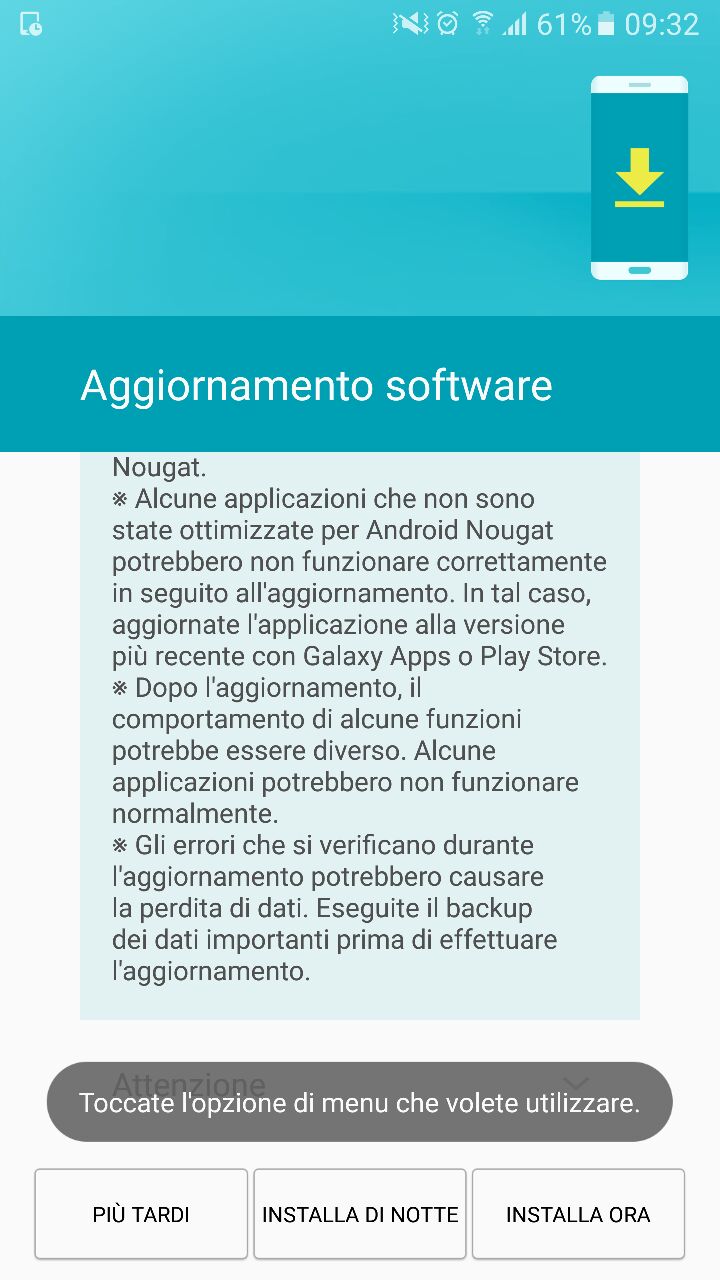 Come al solito vi consigliamo di effettuare il download solamente sotto copertura di una rete WiFi per non consumare tutto il traffico dati della vostra promozione; se ancora non avete ricevuto la notifica di disponibilità dell’aggiornamento, potete provare ad andare sulla voce Info sul dispositivo nel menù delle impostazioni e ricercare l’update.