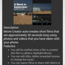 L’applicativo è in grado di creare automaticamente dei brevi filmati (all’incirca 30 secondi) a partire dagli scatti salvati sulla galleria. I video realizzati non sono tuttavia casuali ma basati sulla cronologia delle foto: un filmato può ad esempio avere come fil-rouge una serata con gli amici.