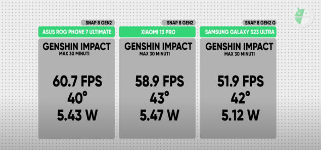 Difatti anche i benchmark lo dimostrano, il ROG Phone 7 Ultimate non è solo lo smartphone che raggiunge i punteggi più alti ma è anche quello che lo fa mantenendo le temperature più basse anche senza ricorrere al Cooler 7, qui non esiste thermal throttiling ci sono le massime prestazioni, sempre. Per fini di test, abbiamo preso i migliori top gamma Android in circolazione ed abbiamo effettuato una run da 30 minuti di Genshin Impact tutto settato al massimo. Non solo il ROG Phone 7 Ultimate è l’unico a tenere sempre costanti quasi 61 fps ma è anche quello che scalda meno. Ah e se lo volete sapere, con il Cooler esterno le temperature scendono di altri 5 o 6 gradi in gaming.