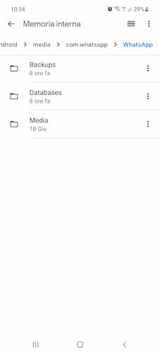 - Il secondo passaggio consiste nel trovare il file di backup in locale dell’app WhatsApp. Se usi Files di Google segui il seguente percorso: “Memoria interna” > “Android” > “media” > “com.whatsapp” > “WhatsApp” > “Database” > “msgstore.db.crypt14”.