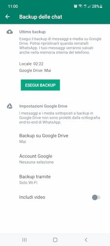 Per quanto riguarda invece il backup in locale, quest’ultimo è già programmato per conservare una copia di tutte le chat WhatsApp con una frequenza giornaliera.