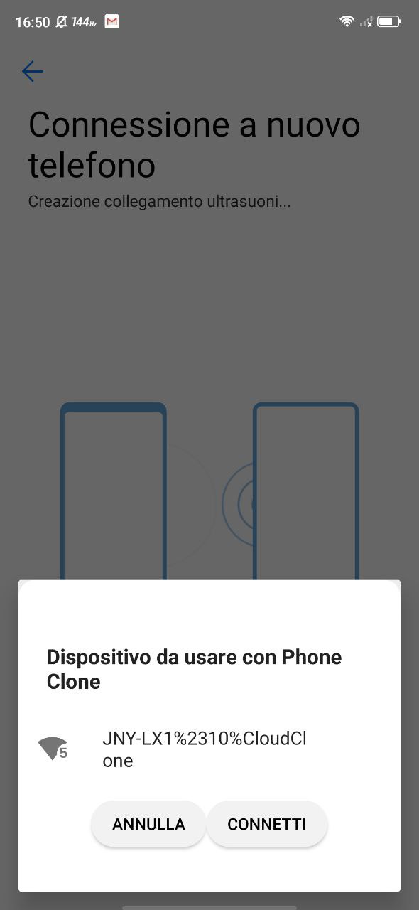 - Inquadrate col vecchio smartphone tale QR Code e in un secondo inizierà il primo tentativo di collegamento, una volta individuato lo smartphone vi comparirà in un pop-up chiedendovi conferma di connessione, confermate;