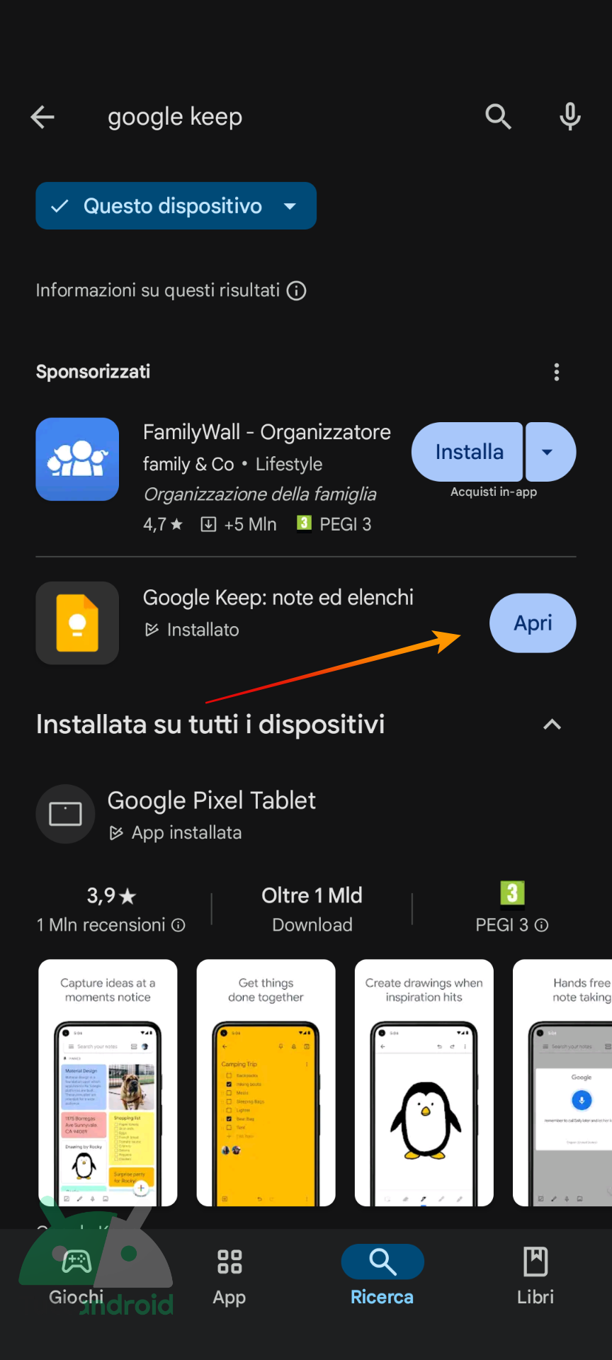 - Scaricate Google Keep dal Google Play Store all’interno del vostro vecchio smartphone o dispositivo principale;